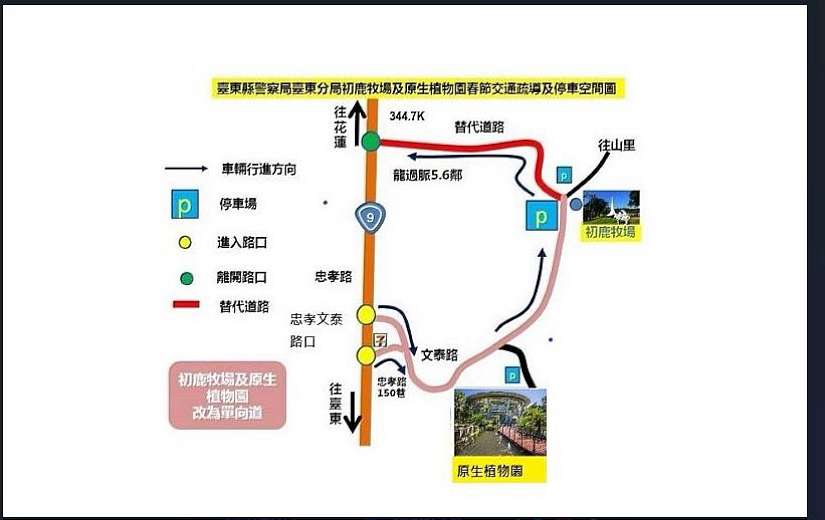 經協調會決議公告,自115年2月17日起至2月22日止,每日上午8時至下午20時止,行車動線實施單向管制,初鹿牧場僅能由卑南鄉忠孝文泰路口進入,行車動向實施單向管制;富岡漁港港區道路亦實施單行道管制,嚴禁違規停車。警方會於沿線加強取締「違規停車」,且初鹿牧場周圍住戶未持有「居民通行證」者禁止「逆向行駛」進入,以避免交通壅塞。