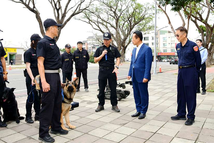 嘉義縣長翁章梁特別於今日下午前往嘉義縣警察局慰勉投入治安維護的員警,其中支援警力有保一總隊維安特勤大隊13人、保三總隊警犬分隊4人3犬及刑事局防爆小組1車3人。現場展示員警應勤裝備及因應重大活動維安使用的特殊器材,有金屬探測器、防爆毯及防爆機器人等,另外長相可愛的偵爆犬相當吸睛,負責偵爆犬訓練的員警表示,通常挑選年齡在2歲以下的成犬,接受約3至6個月的訓練,通過評核後才能成為合格偵爆犬,役期通常約4至7年。