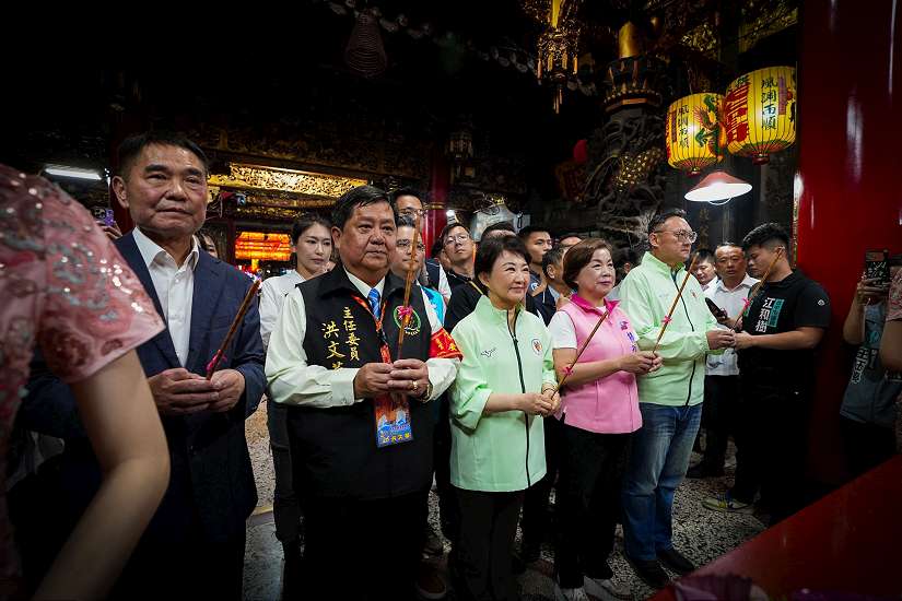 台中市長盧秀燕前往拱天宮參拜祈福-與苗栗縣長鍾東錦及拱天宮主委洪文華一同恭請媽祖登轎-虔誠祈求進香活動平安順利圓滿成功-圖/台中市政府提供