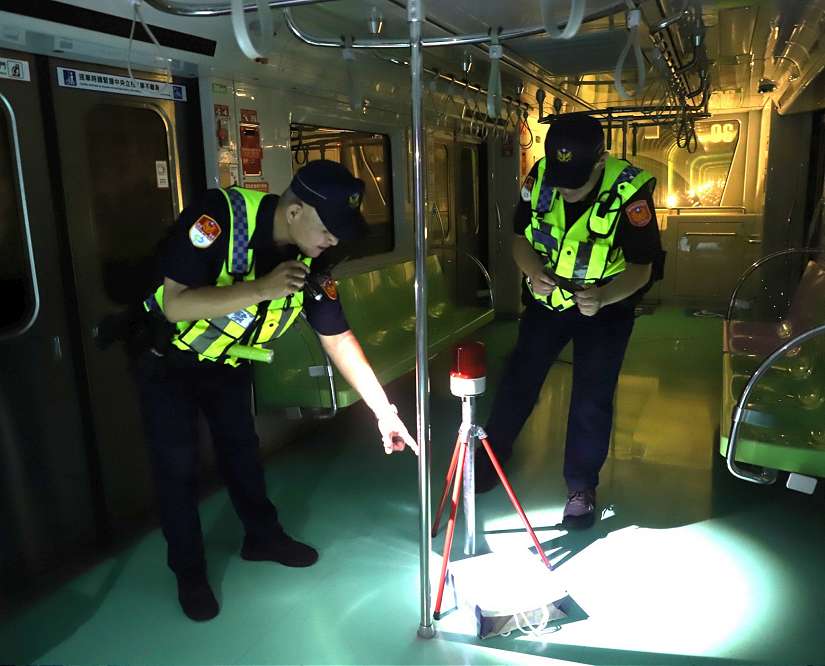 中捷公司會同警消單位共同辦理模擬演練/旅客手提袋內行動電源冒煙-員警進行鑑識作業-圖/台中市政府提供