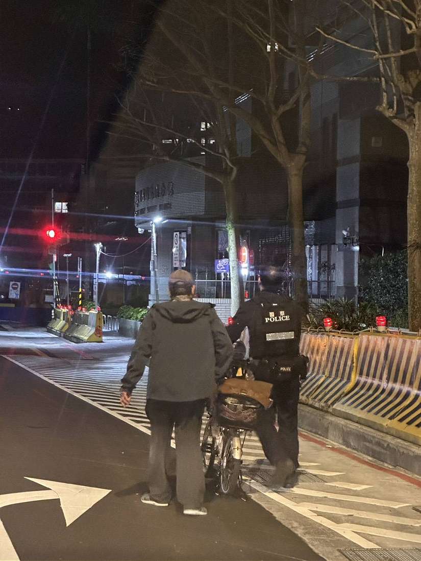 因該腳踏車傳動鍊條故障無法騎乘,莊員乃牽著自行車陪同老人家徒步走回派出所,因夜間涼意甚濃,莊員更隨時注意老翁身體,返回派出所後更提供熱茶讓老翁稍作休憩,直至家屬趕來接回,離去前莊員更貼心提醒家屬返程注意安全,老翁的兒子對警方的細心照顧與暖心協助深感感激,連聲向警方致謝。
