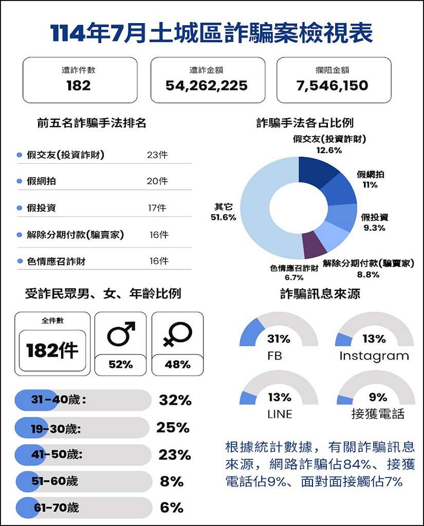 詐騙案件飆升,民眾血汗錢遭詐團掠奪!警方呼籲:反詐守錢招式,識破陷阱保荷包!新北市政府警察局土城分局統計指出,114年7月份土城區共發生182件詐騙案件,造成新臺幣5,426萬餘元的損失。雖然警方與銀行合作成功攔阻754萬元,守住部分民眾資金,但仍有大量血汗錢遭詐騙集團奪走,令人痛心。