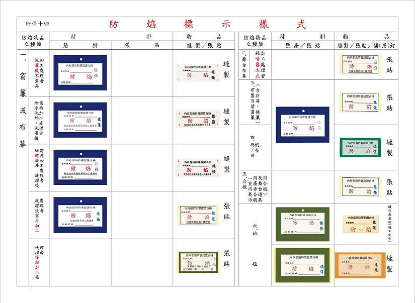 依據《消防法》第11條規定,凡「地面樓層達十一層以上之建築物、地下建築物及中央主管機關指定之場所」,其管理權人對於建物內的地毯、窗簾、布幕、展示用廣告板及其他指定之防焰物品,均應使用具有防焰性能並附有「防焰標示」的產品,以降低火災發生時延燒的風險。