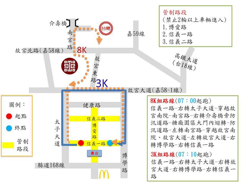 一、8公里組:信義一路-右轉太子大道-穿越故宮南院-南宮路-右轉介壽橋旁防汛道路-糖廠園區大門內迴轉-防汛道路-左轉南宮路-穿越故宮南院、故宮大道-左轉故宮大道-右轉博學路-右轉信義一路。