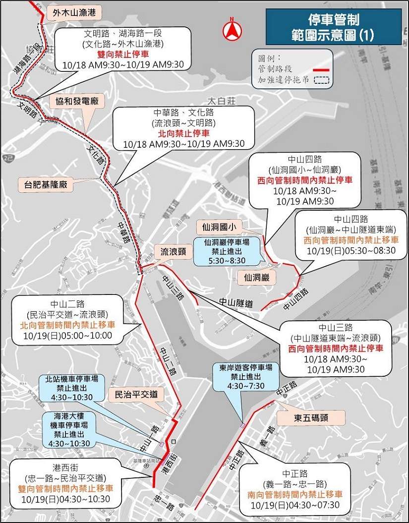 另活動前一日(10月18日)上午8時30起至10月19日上午9時30分止,將針對部分活動路段進行停車管制,包含中山三路西向(中山隧道東端至流浪頭)、中山四路西向(仙洞國小至仙洞巖)、中華路及文化路北向、文明路及湖海路一段(文明路至外木山漁港)雙向;管制期間禁止移車(配合道路管制)路段包含中正路南向(義一路至忠一路)、港西街雙向、中山二路北向(民治平交道至流浪頭)、中山四路西向(仙洞巖至中山隧道東端),另開放中山高中、中山國小、仙洞國小共計79格汽車停車位供民眾臨時停車使用,請駕駛人務必提前將車輛移離,必要時警方將實施拖吊,並依道路交通管理處罰條例第60條第2項第2款規定予以舉發,經拖吊之車輛另需繳納移置費及保管費,請駕駛人多加注意。
