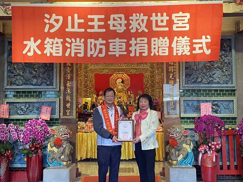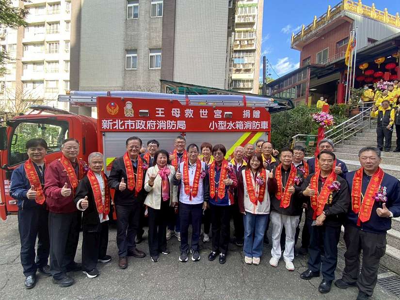 王母救世宮於2016年安座於汐止,供奉王母娘娘與金母娘娘,數年來不僅香火鼎盛,更以「慈悲救世、護佑眾生」為宗旨,長期投入社會公益,近年來已連續捐贈災情勘查車及多項裝備器材予警消團體。這次捐贈的水箱消防車為2噸級水箱車,配備高壓泵浦、可迅速於無消防栓地區獨立供水,特別適合汐止山坡地住宅、老舊社區巷弄及基隆河沿岸災害搶救。