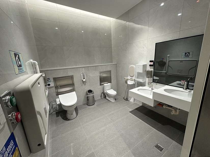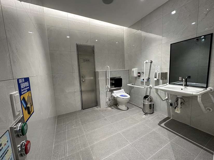 坐式廁間全面設置免治馬桶座墊,提供溫熱座墊與溫水清洗功能;並備有馬桶座墊消毒液、衛生紙,旅客使用更安心。
