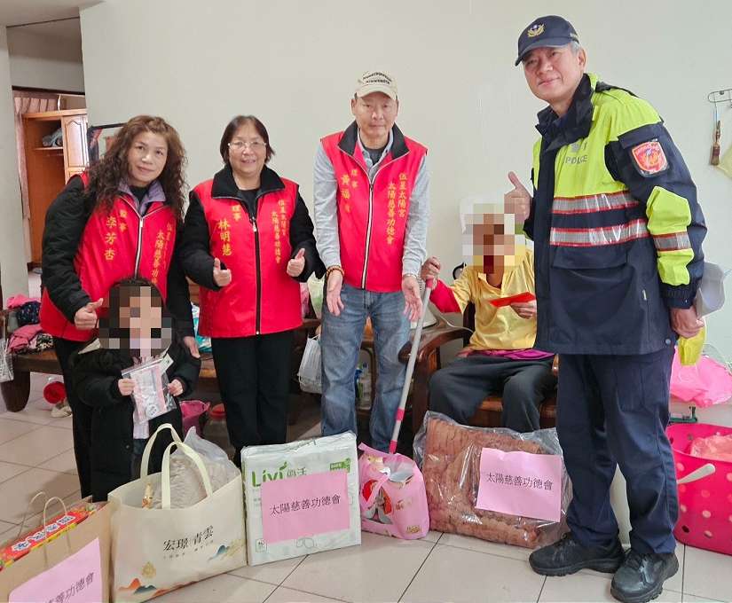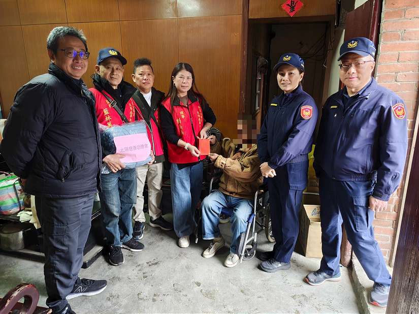 樹林警分局結合慈善團體「太陽功德會」,歲末寒冬送暖,一起關懷樹林地區獨居長者及弱勢民眾,日前在副分局長廖盈如、太陽功德會會長藍清標等人陪同下,前往關心樹林區獨居老人、中低收入戶等弱勢民眾共計20戶,分別發送生活物資及2千元慰問金;其中一名年近9旬賴姓長者,喪偶、無親戚子女,獨居在樹林區樹人里4樓老舊公寓內,患有三高等疾病且需使用助行器方能行走,生活諸多不便,僅靠政府每月低收入補助維生,他接獲沙拉油、白米及2千元慰問金後,非常感謝善心人士能讓他過個好年。
